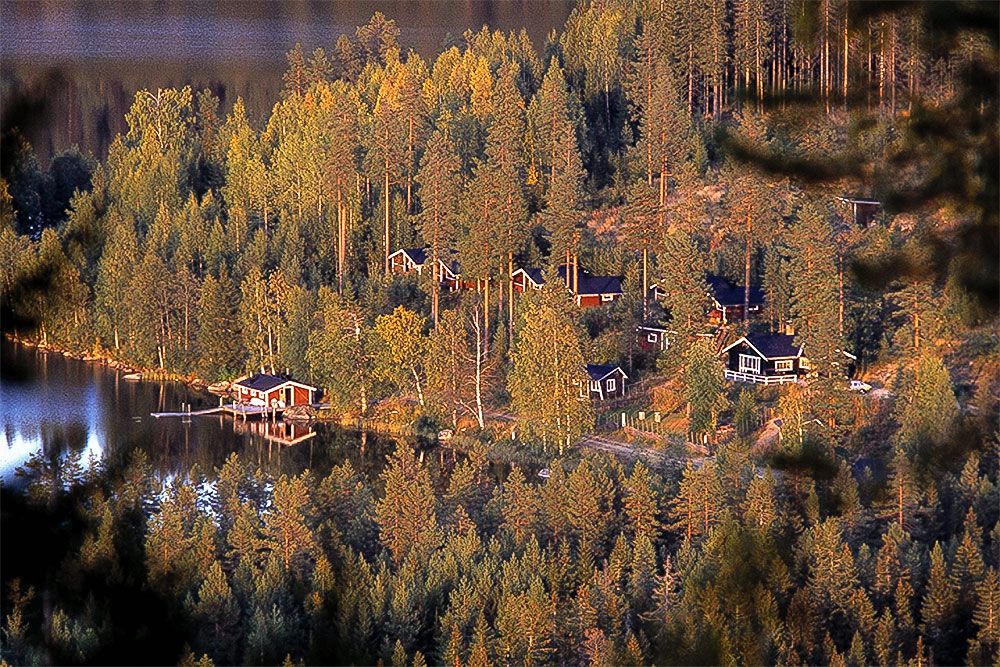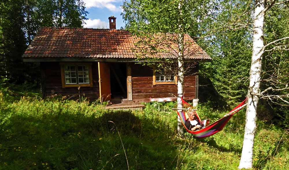 Västersluttningen vid sjön Stora Öjungen är platsen där lodgen ligger med storstuga och 6 sovstugor. Hit har el och moderna faciliteter inte nått – vi genererar vår egen ström.